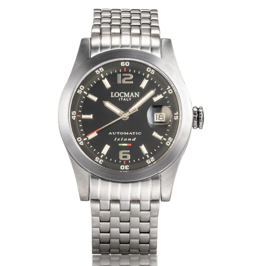 Orologio automatico Locman da uomo della linea Island con quadrante nero a due livelli e secondiera, cassa in acciaio da 40mm finitura lucida e satinata e morbido bracciale in acciaio, vetro zaffiro, fondello in titanio, impermeabile 5 bar. movimento solo tempo con datario. cod 0615A01A-00BKNKB0