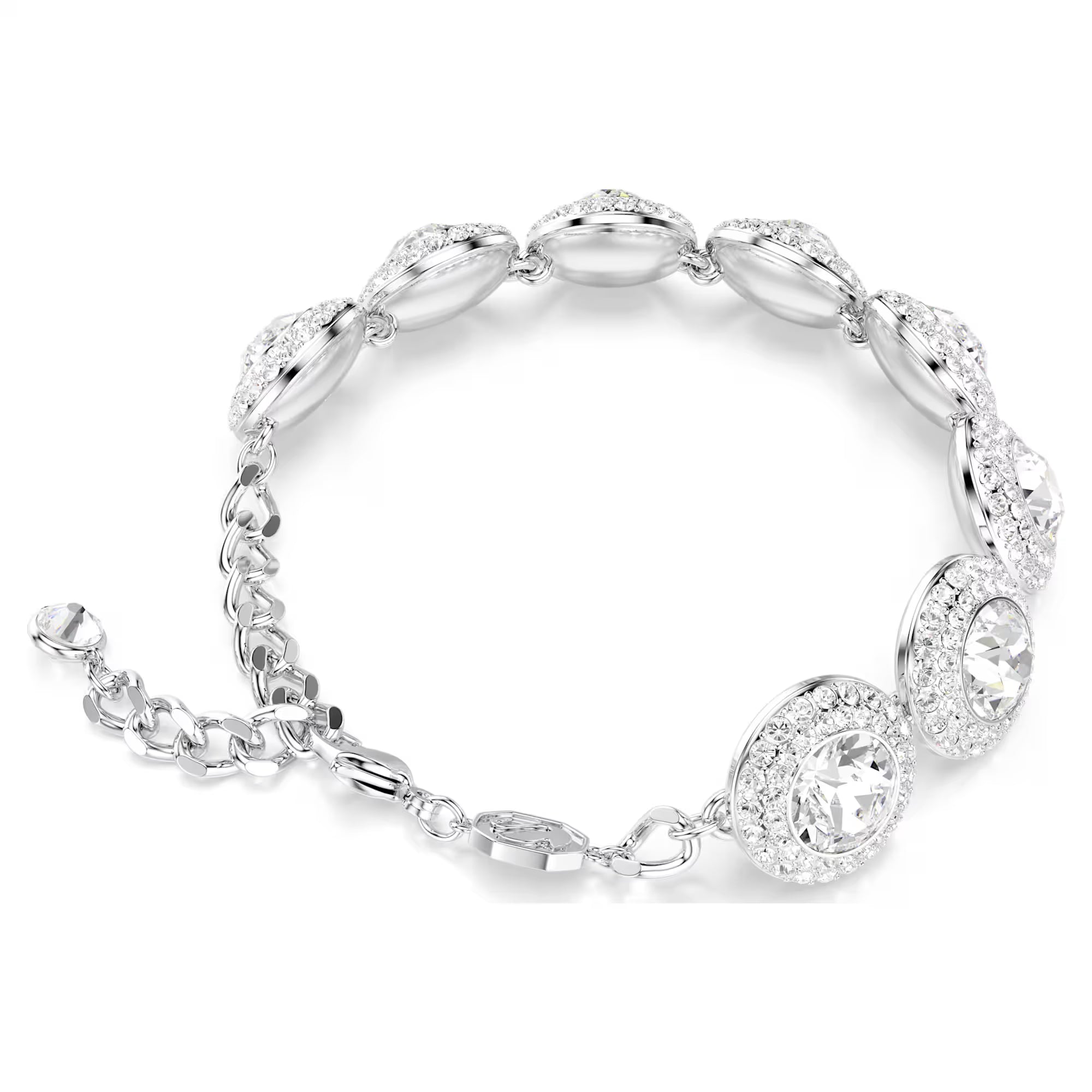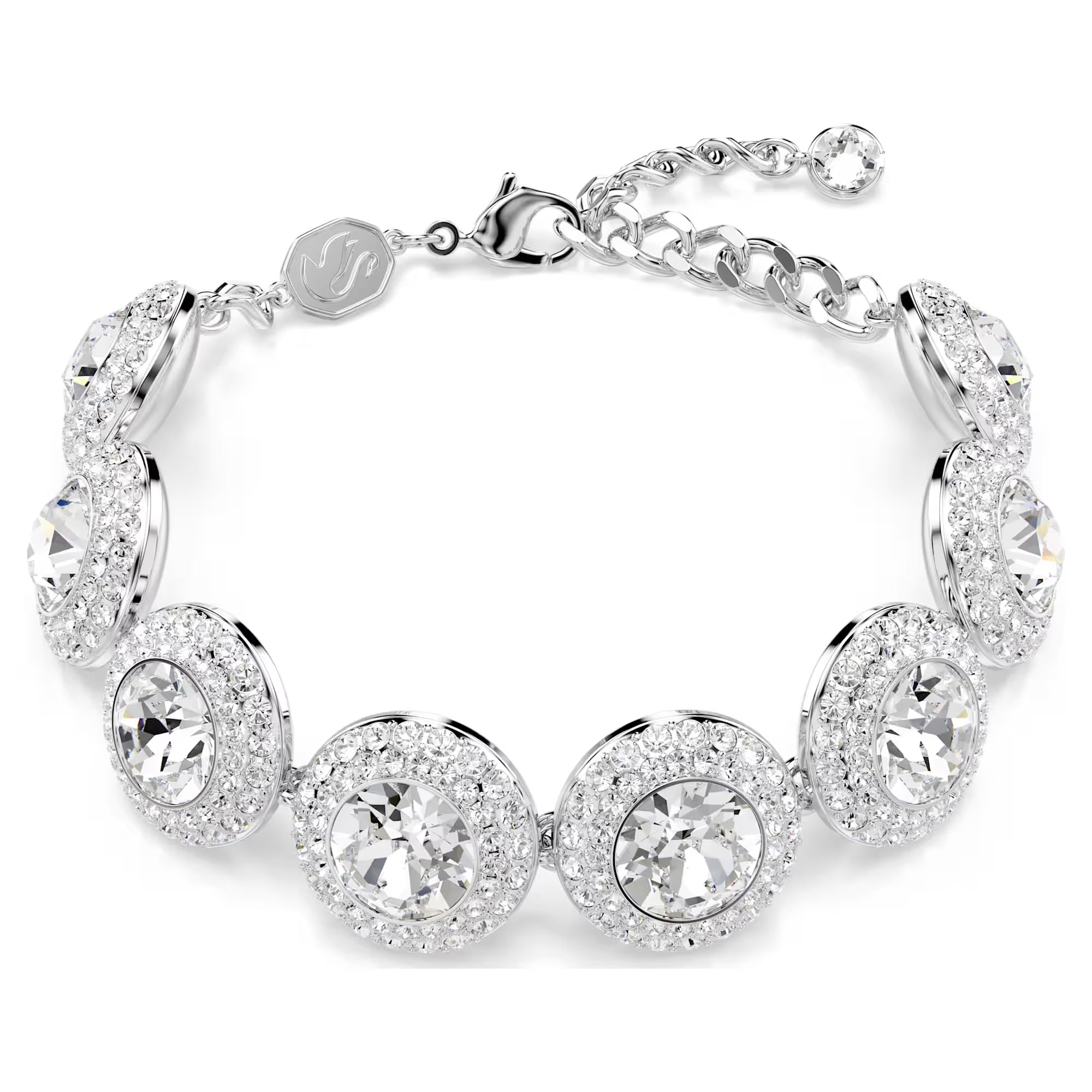Avvolgi il tuo polso nella meraviglia di questo bracciale Swarovski che cattura la luce. La catena placcata rodio presenta un gancio a moschettone ed è impreziosita da una fila di significativi motivi a forma di angelo. Abbinalo ad altri gioielli della linea Una Angelic per un look di massima radiosità.