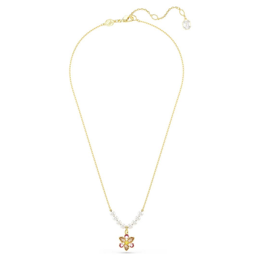 Questo affascinante pendente aggiunge un tocco magico e naturale a qualsiasi outfit. La catena placcata in tonalità oro presenta otto Crystal Pearls Swarovski, elegantemente incastonate ai lati di un singolo fiore, realizzato con cura con cristalli di vari tagli e colori tenui. Il gioiello include un gancio a moschettone e un prolungamento per una vestibilità regolabile. Uno straordinario regalo di lusso per un facile uso quotidiano.