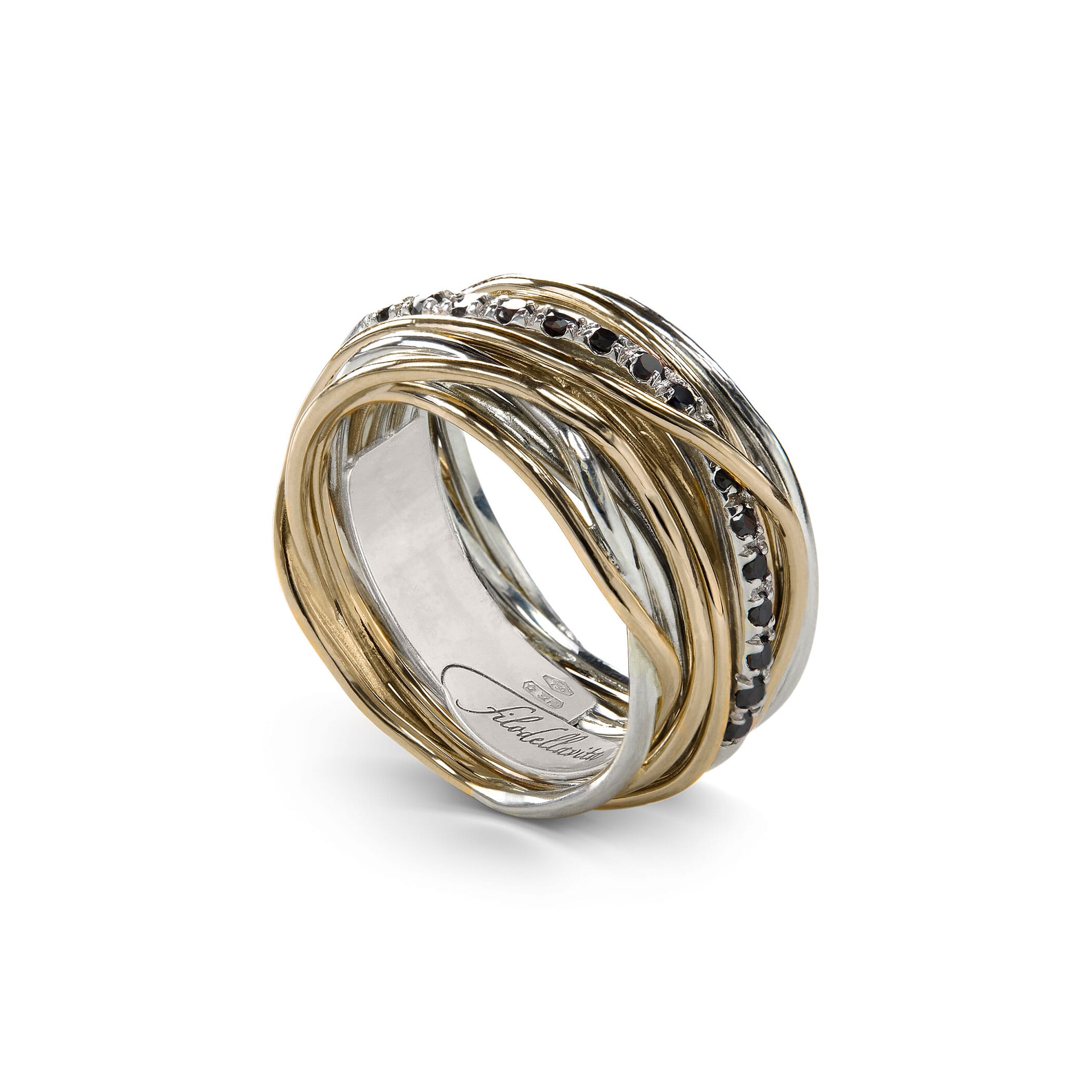 Anello Filodellavita Classic Collection, 13 Fili in Oro Giallo 9kt, Argento .925 e 16 Diamanti Black 0.21 ct