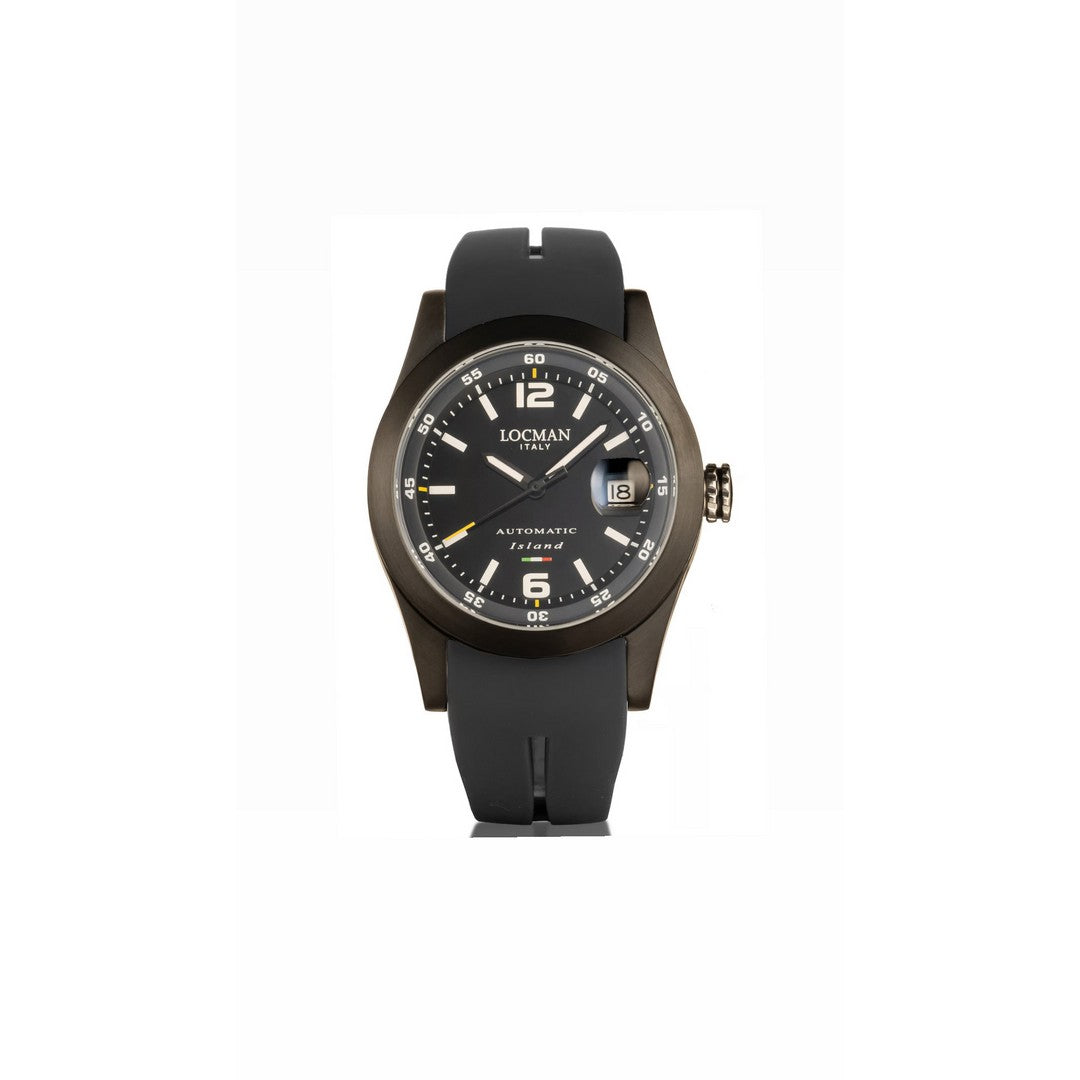 Orologio automatico Locman da uomo della linea Island con nuovo quadrante nero a due livelli e secondiera, cassa in acciaio da 40mm con trattamento PVD nero e cinturino in silicone abbinato, vetro zaffiro, fondello in titanio, impermeabile 5 bar. movimento solo tempo con datario. cod 0615K01S-BKBKWHSK