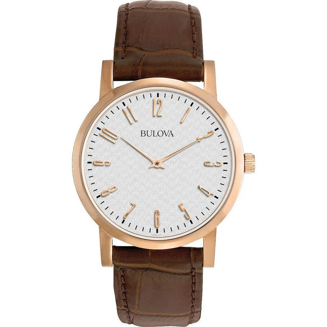 Presentazione del Bulova Dress Duets - 97A106, un orologio sofisticato progettato per gli uomini che apprezzano l'eleganza classica. L'orologio presenta una cassa in acciaio inossidabile con una raffinata finitura IP oro rosa, che misura un'elegante dimensione di 38 mm. Il design raffinato è completato da un resistente vetro minerale, che garantisce una chiarezza duratura.