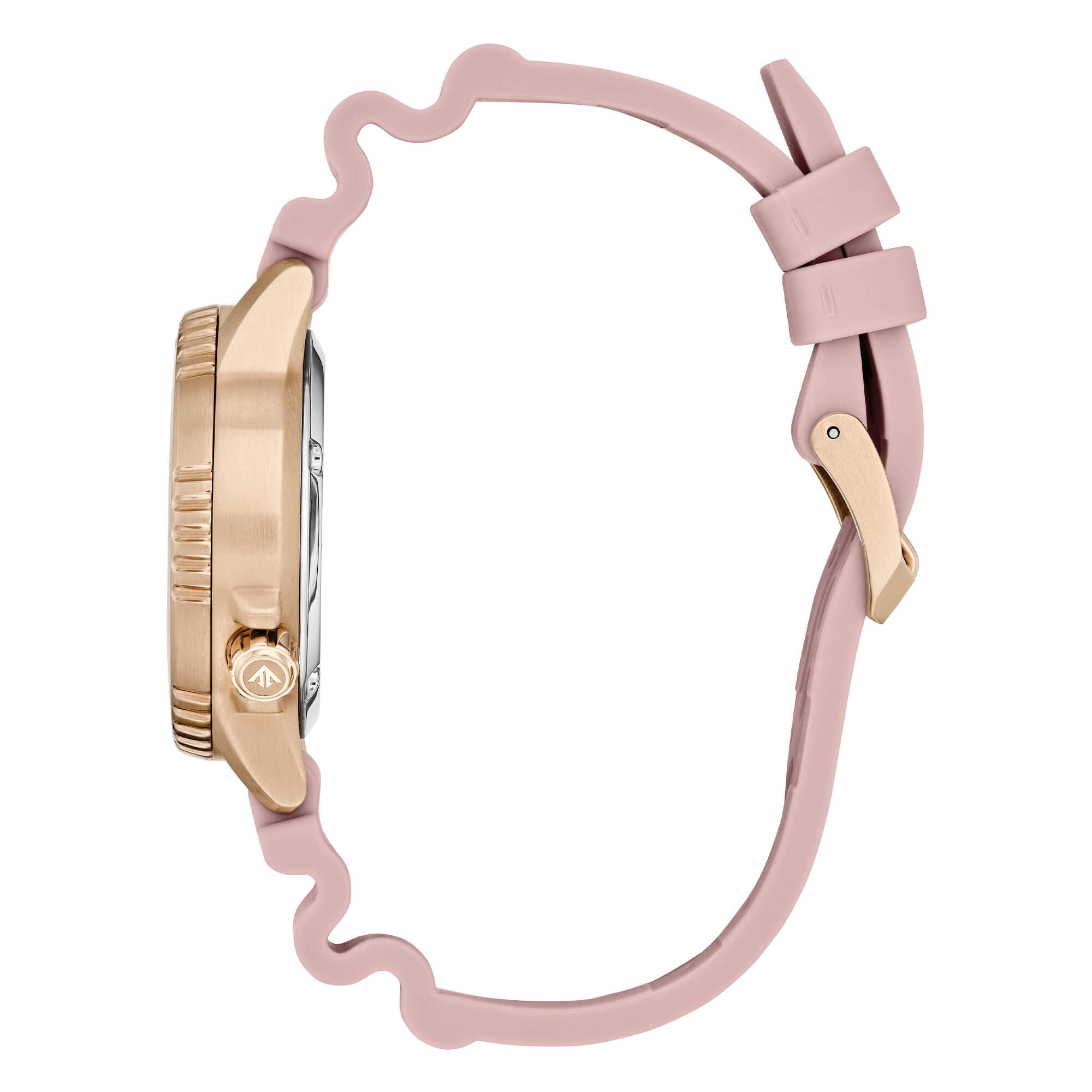 Cassa in acciaio. Ghiera girevole con inserto alluminio. Valvola per elio. Cinturino in poliuretano. Vetro minerale. WR 20 bar.