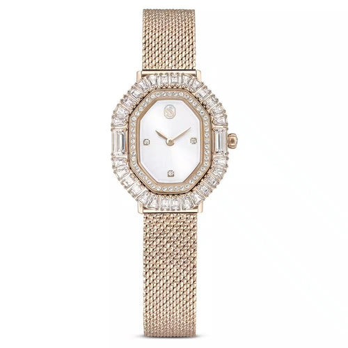 Questo innovativo orologio è una creazione unica nel suo genere che combina il design distintivo con la maestria della luce. Realizzato con autentico savoir-faire, l’orologio è ispirato alla famiglia di gioielli Matrix e presenta una cassa in acciaio inossidabile di 13 x 18 mm con finitura in tonalità oro champagne. La lunetta è presentata nell’iconica forma ottagonale di Swarovski e include un meraviglioso mix di 78 cristalli Cry e Swarovski Zirconia taglio Round e Fancy incastonati. Si crea così una radiosa cornice per il quadrante minimalista con motivo sunray, che mostra elegantemente tre indici delle ore in cristallo e un logo cigno. Un singolo cristallo è inoltre posizionato all’interno della corona, mentre intorno al polso, il lusso è ulteriormente accentuato da un bracciale in mesh regolabile. Questo orologio è resistente all’acqua fino a 50 m e simboleggia il moderno lusso di Swarovski nella sua massima espressione.