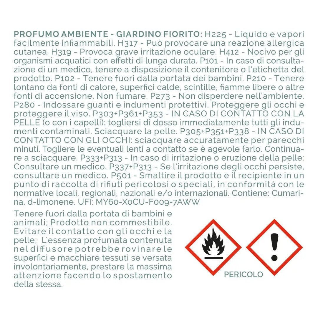 Cura del prodotto: tenere fuori dalla portata di bambini e animali; prodotto non commestibile. evitare il contatto con gli occhi e la pelle; l'essenza profumata contenuta nel diffusore potrebbe rovinare le superfici e macchiare tessuti se versata involontariamente, prestare la massima attenzione facendo lo spostamento della stessa