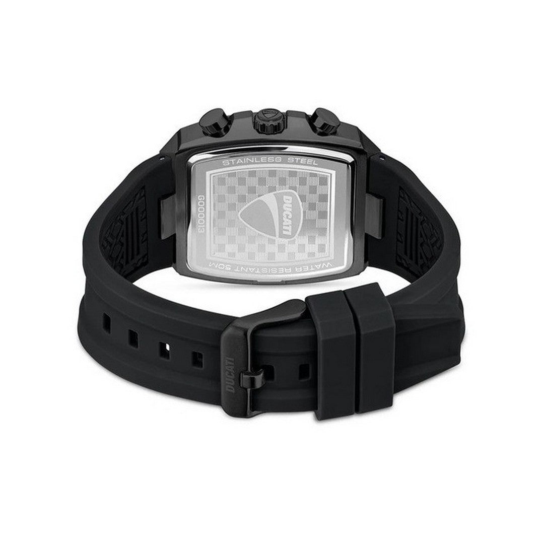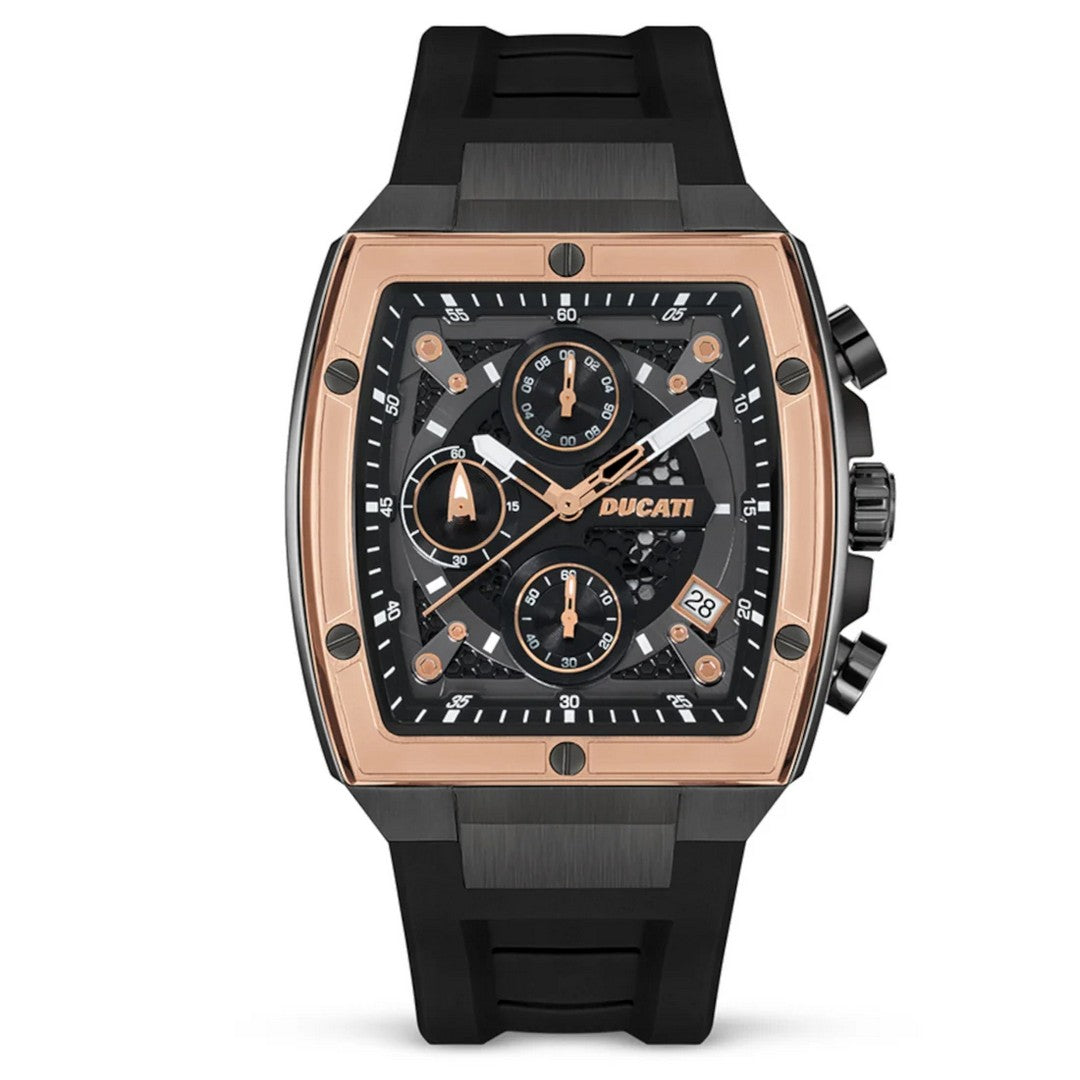 Cronografo con cassa in acciao tonneau pvd nera ed inserti placcati oro rosa. Movimento al quarzo. Cinturino in caucciu. Impermeabile fino a 5 bar. Dimensioni mm 40 x 38. Completo di scatola e garanzia.