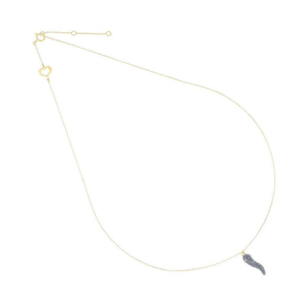 Collana girocollo della collezione Maman et Sophie Aurum Tié da donna. Colore: oro e argento. Il gioiello è realizzato in oro giallo 750‰ (18kt) e presenta un cornetto passante in polvere di diamanti cromo. Il girocollo può essere regolato in tre misure: 36,5 cm, 38,5 cm e 40,5 cm. All'estremità del girocollo è presente il cuore Maman traforato. Chiusura a moschettone.