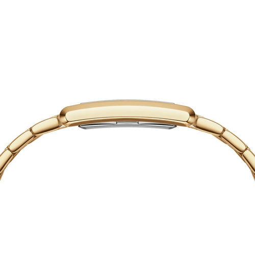 Grazie al loro profilo geometrico slanciato e due taglie da scegliere, gli orologi della collezione Bound esprimono una perfetta simmetria da indossare al polso. Questo orologio di color oro vanta una scocca curvata di forma rettangolare che si abbina alla larghezza del suo cinturino a 9 maglie, creando così un quadrante radiale color smeraldo perfettamente integrato.